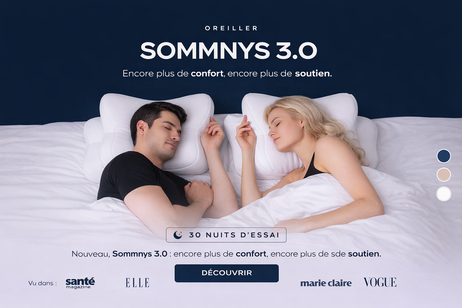 L'Oreiller Sommnys 3.0 est notre produit phare nouvelle génération, offrant un soutien ergonomique et un confort inégalé. Sa mousse intelligente à mémoire de forme s'adapte parfaitement à toutes vos positions de sommeil pour garantir un alignement optimal de votre tête, cou et colonne vertébrale. Rejoignez les milliers de dormeurs satisfaits et faites l'expérience d'une nuit de sommeil réparateur dès ce soir.